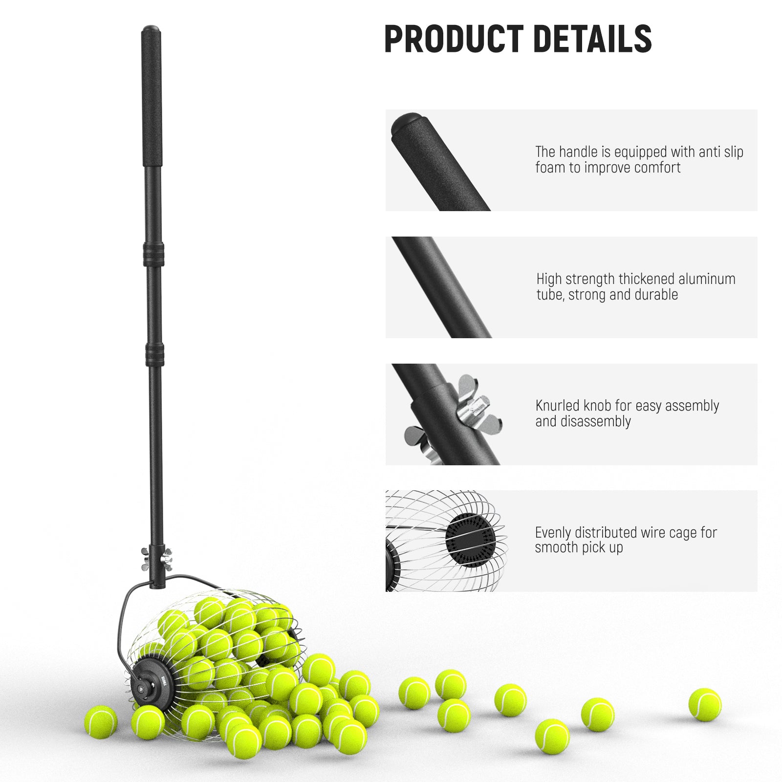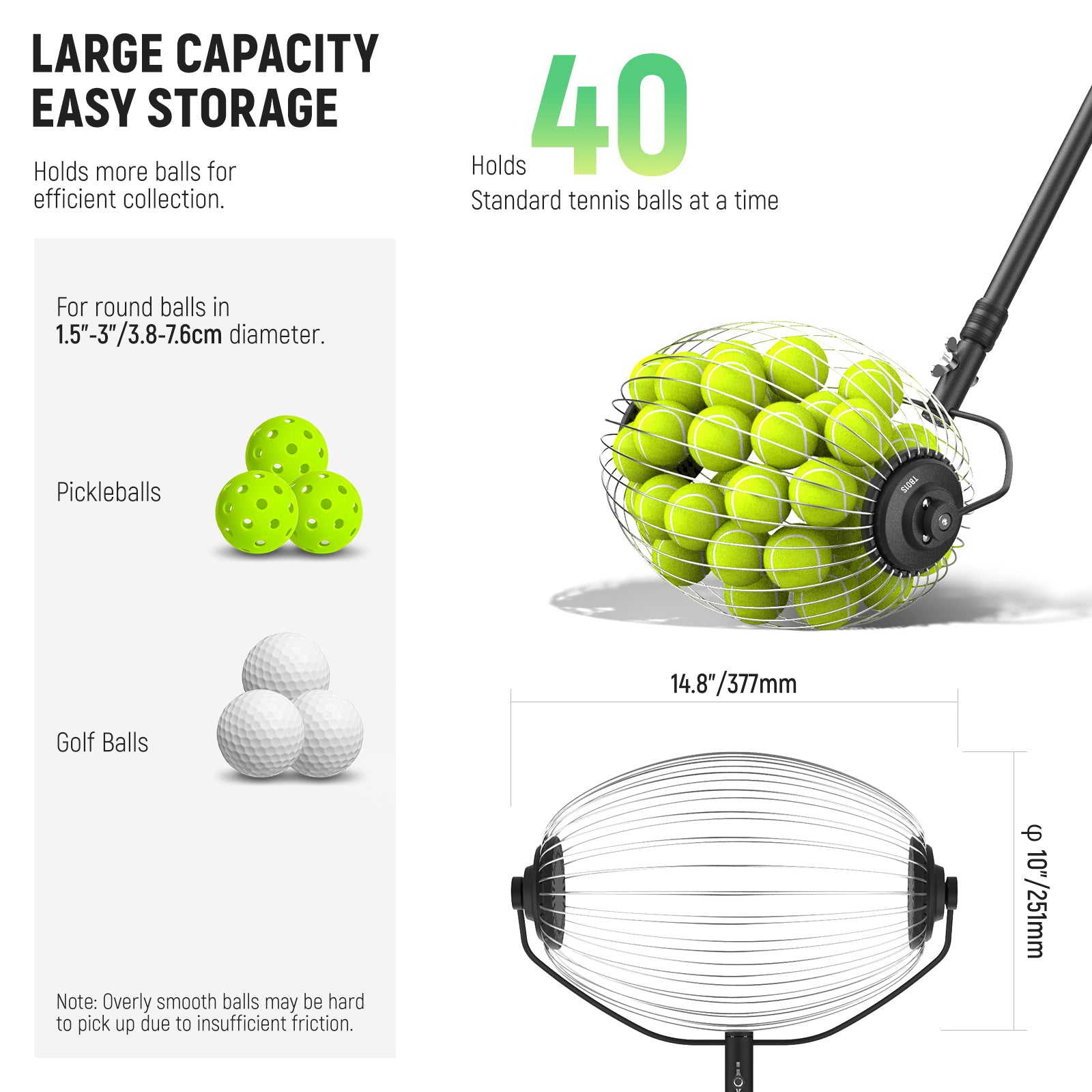 - Capacidad para hasta 40 pelotas : El rodillo recolector mide 25 x 38 cm (φ9.8" x L15") y ofrece un amplio espacio para hasta 40 pelotas de tenis estándar (60-68 mm). Gracias a sus alambres flexibles, también es adecuado para recoger otras pelotas de 3.8-7.6 cm (1.5"-3"), como pelotas de pickleball o de golf. Para extraer las pelotas, separe manualmente los alambres. Nota: No apto para objetos demasiado lisos.
