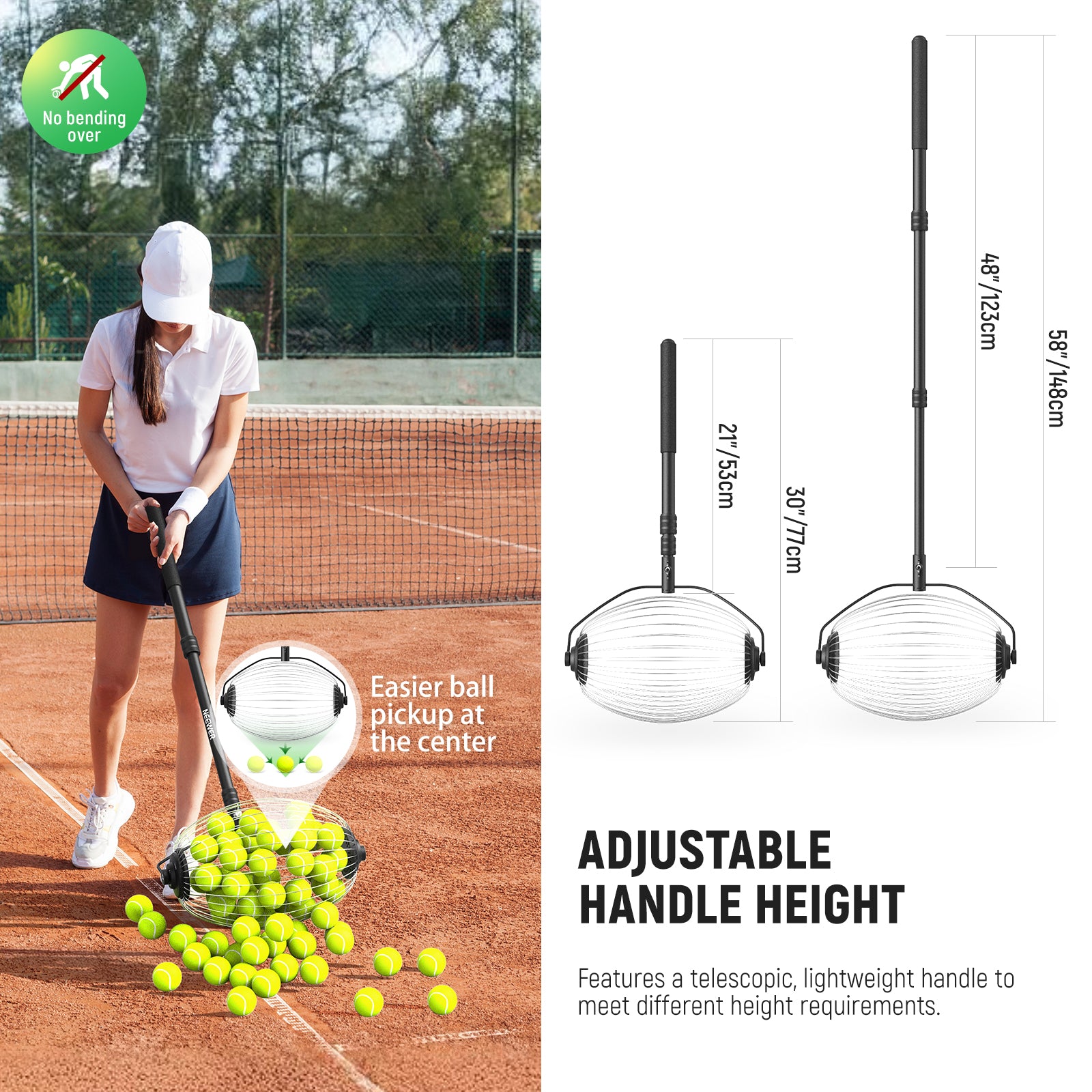 - Altura ajustable para una comodidad óptima : El mango telescópico permite ajustar la altura del recogedor de pelotas de tenis entre 77 y 148 cm (30 y 58 pulgadas) para adaptarse a usuarios de diferentes alturas. El extremo está recubierto de espuma suave y antideslizante para un agarre cómodo. Garantiza una experiencia agradable para todos, ahorrando tiempo y evitando molestias, para que puedas concentrarte más en tu práctica.
