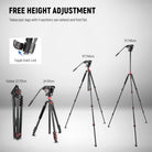 - Cabezal de giro con arrastre de fluido de primera calidad : tome fotografías panorámicas espectaculares con el cabezal de giro de 360° y mantenga siempre el nivel recto con la ayuda del nivel de burbuja. El ajuste de inclinación de -70°/+90° le permite colocar la cámara en cualquier ángulo para tomas desde arriba o en ángulos bajos, o tomar fotografías en forma vertical u horizontal. El mango de arrastre telescópico se puede montar en ambos lados y permite girar el cabezal de fluido con cualquier mano. Un orificio para tornillo lateral de 1/4" en el costado para micrófonos, monitores o luces.