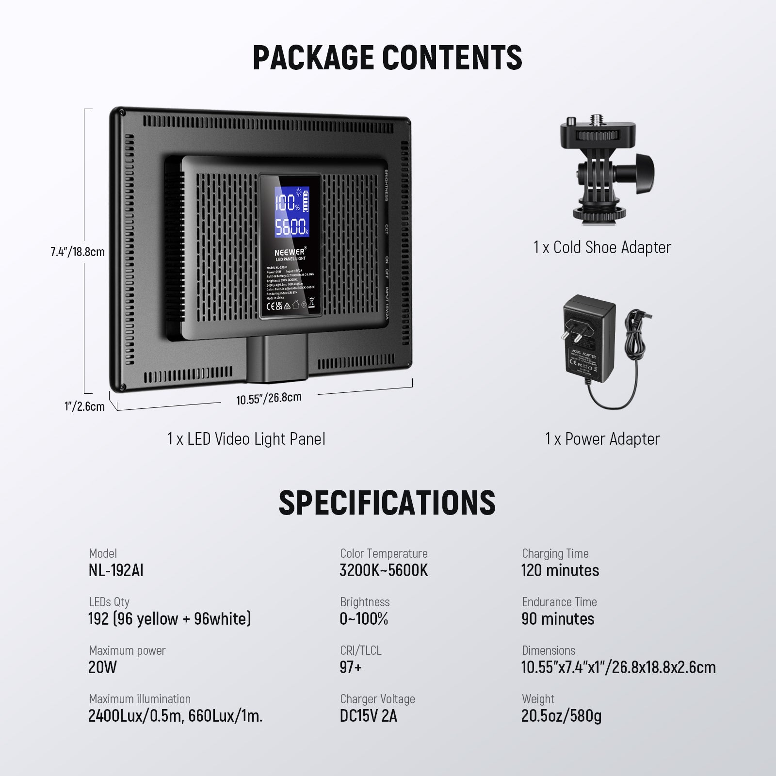 - Batería de litio integrada de 8000 mAh y cargador portátil : batería de litio integrada de 8000 mAh que ofrece hasta 90 minutos de iluminación continua con un brillo del 100 %. También puedes cargar el panel de luz con el cargador incluido (2 horas para completar la carga con una carga rápida de 15 V y 2 A), lo que garantiza una alimentación ininterrumpida durante todo el día.