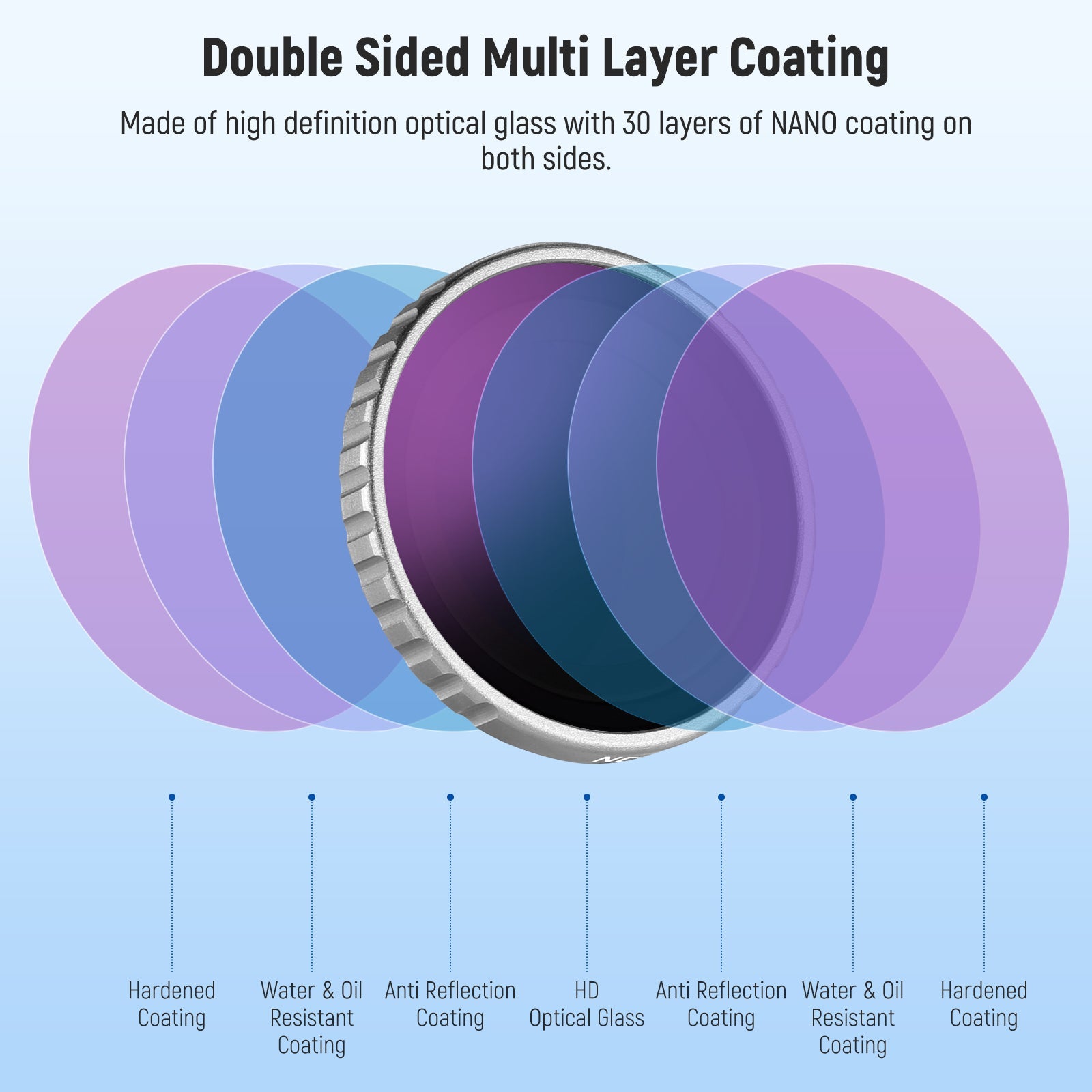 - Vidrio óptico de alta calidad y nanorrevestimiento : fabricados con vidrio óptico de alta definición con 30 capas de nanorevestimiento en ambos lados, estos filtros brindan una protección superior contra el polvo, el aceite, las huellas dactilares y los rayones, al tiempo que reducen los reflejos de los filtros y del suelo.