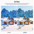 - Filtro UV protector : este filtro UV reduce la neblina y minimiza los rayos ultravioleta (UV) al tiempo que mejora el contraste. Perfecto para capturar fotografías de nieve y gran altitud sin el tono azulado. Mantenga este filtro en su lente para protegerlo contra el polvo, rayones, huellas dactilares y golpes.