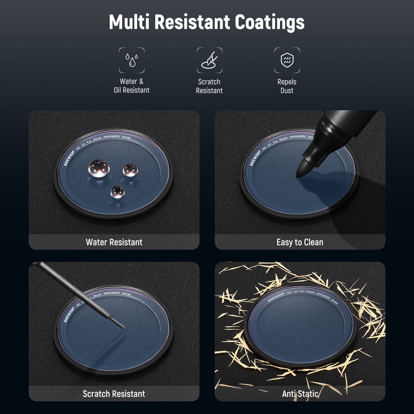 - Vidrio óptico HD multicapa : con revestimientos de múltiples capas en el vidrio óptico de primera calidad, este filtro UV bloquea los rayos ultravioleta (300-410 nm) y ofrece una transmisión de luz del 99,8 % y una reflectancia mínima inferior al 0,1 % para reducir los destellos y las imágenes fantasma y, al mismo tiempo, garantizar una precisión. reproducción cromática y es antiestático, resistente al aceite, al agua y a los rayones.