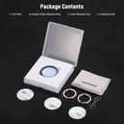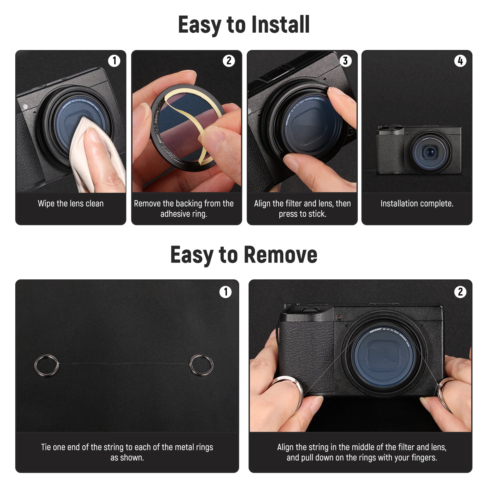 - Anillo adhesivo extraíble : utilice el anillo adhesivo incluido para colocar sin esfuerzo este filtro UV en la lente de su cámara. Fácil de quitar con la herramienta de extracción incluida y no agrega volumen a su cámara mientras dispara o está en movimiento.