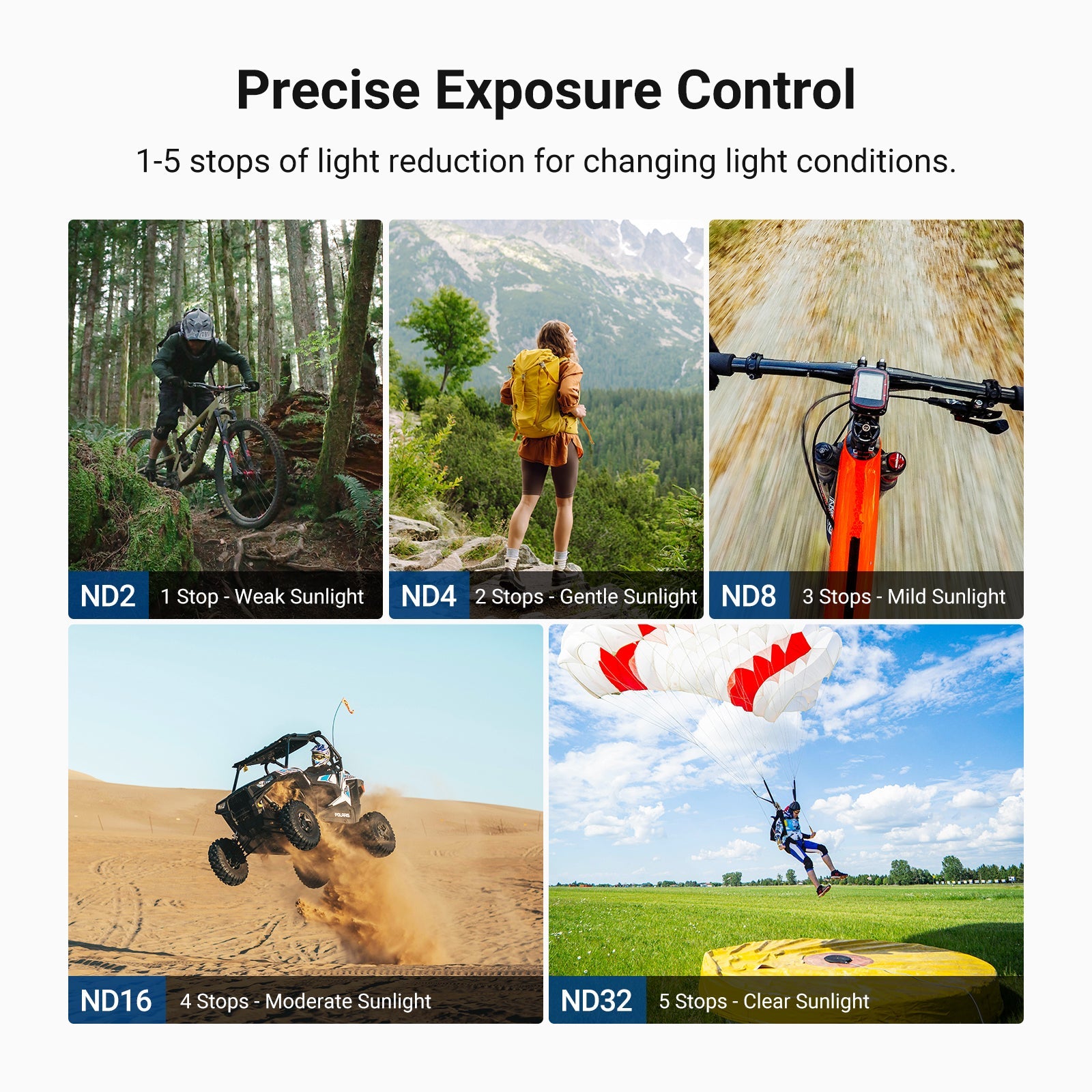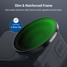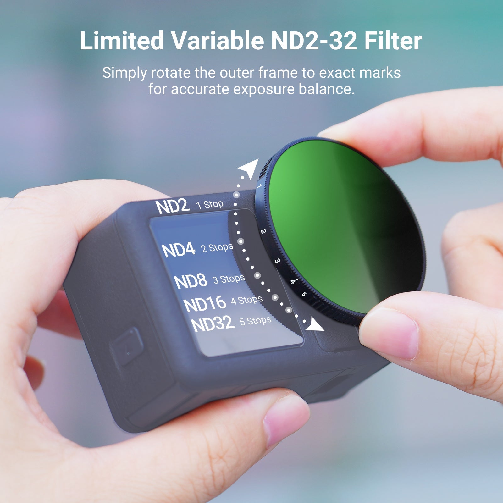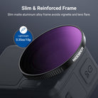 • Flexible Exposure Control- Variable ND2-32 filter cuts light by 1-5 stops to prevent overexposure in various conditions while adding dynamic motion blur effects. Rotate the frame for accurate ND adjustment
