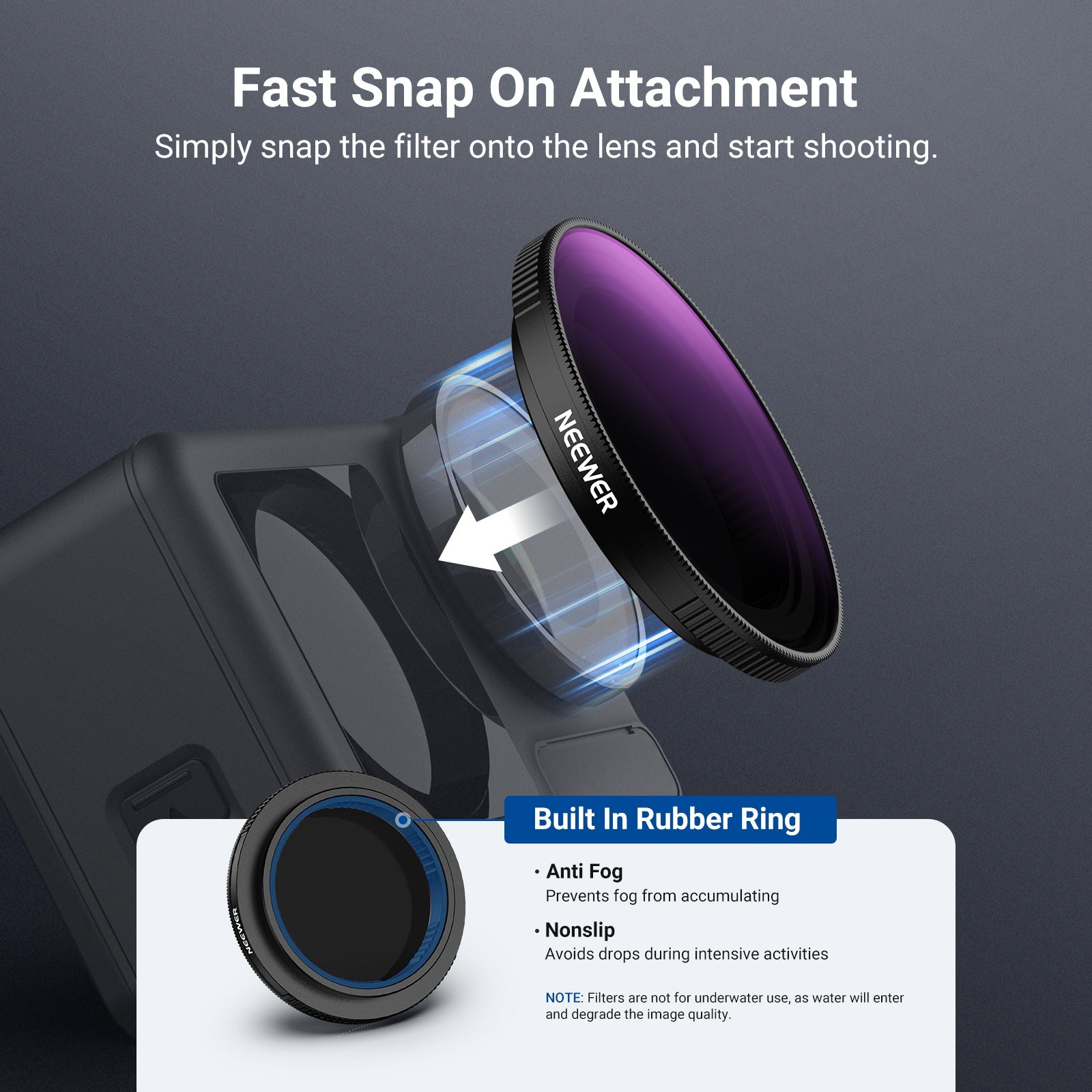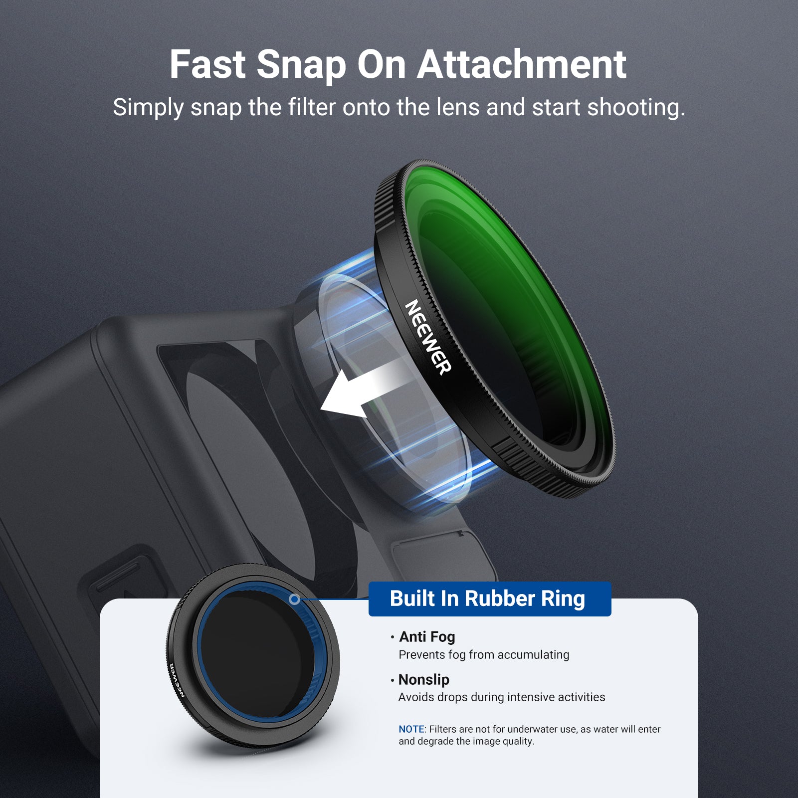 • Fast Snap On Attachment- Simply snap the filter onto the lens and start shooting. Note: The filter is not for underwater photography, as water will enter and degrade image quality