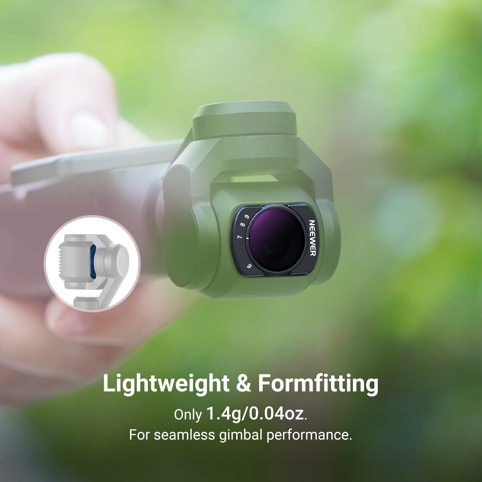 • Quick Magnetic Attachment- Instantly attaches to the camera via magnets. The slim and lightweight frame preserves gimbal accuracy and will not interfere with powering on or off