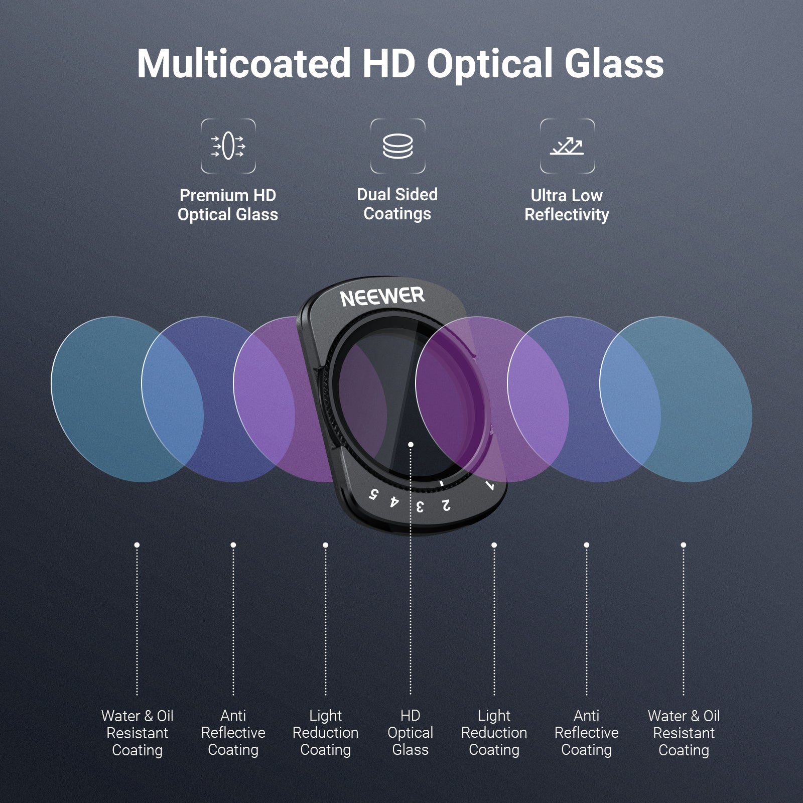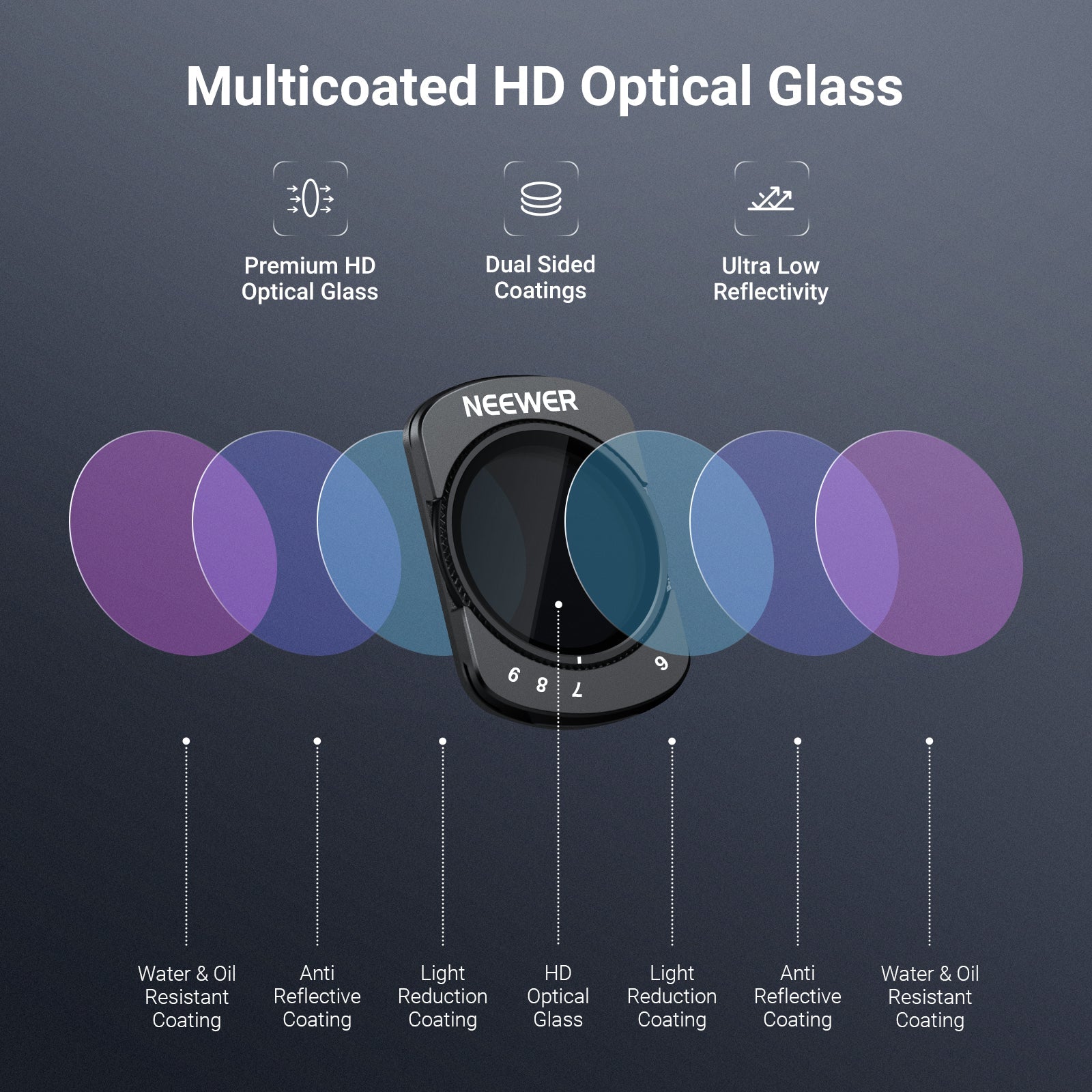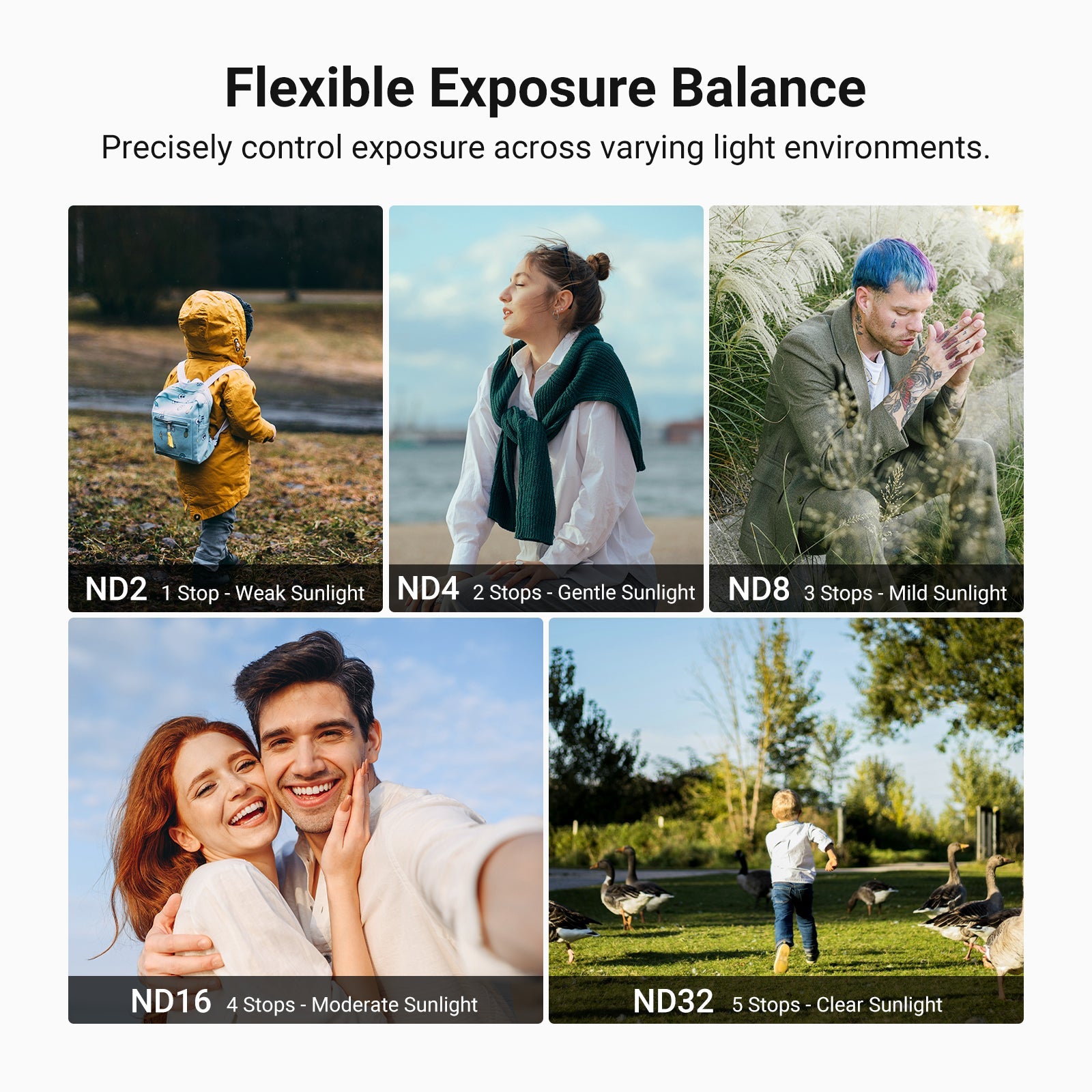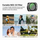 • Flexible Exposure Control- Variable ND2-32 and ND64-512 filters offer 1-5 and 6-9 stops of light reduction for exposure balance in different lighting conditions and dynamic motion blur effects. Rotate the frame to precisely adjust neutral density levels