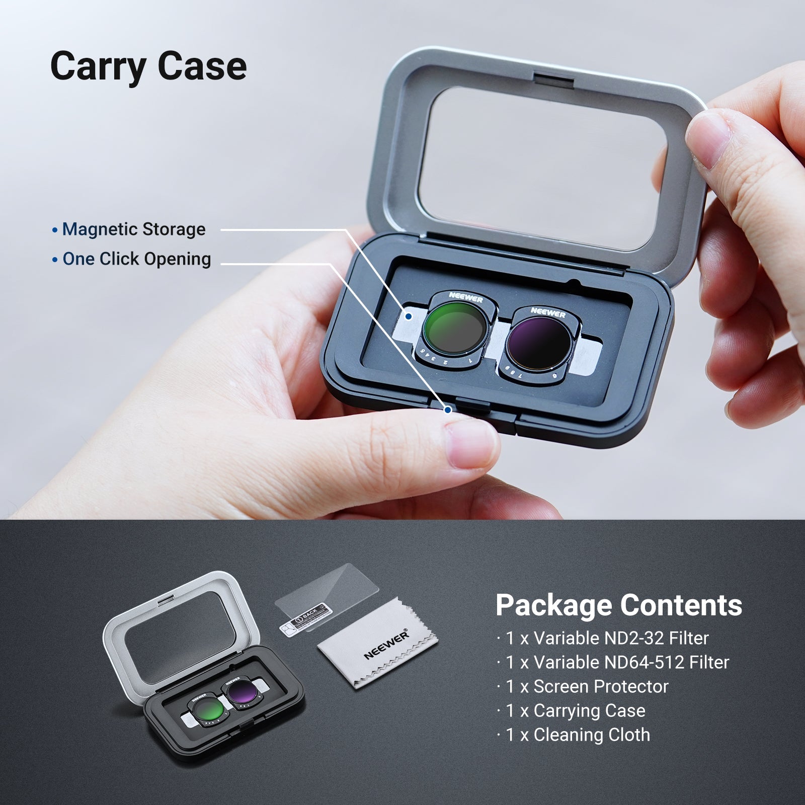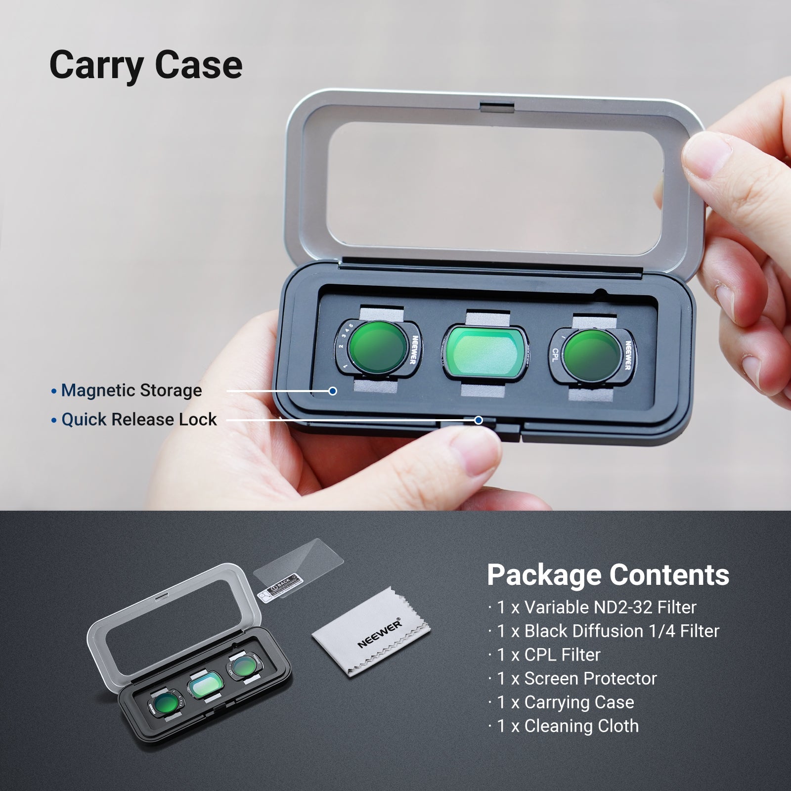 • Screen Protector & Carry Case- Screen protector shields the touchscreen from scratches while the magnetic carry case keeps filters organized, safe, and portable
