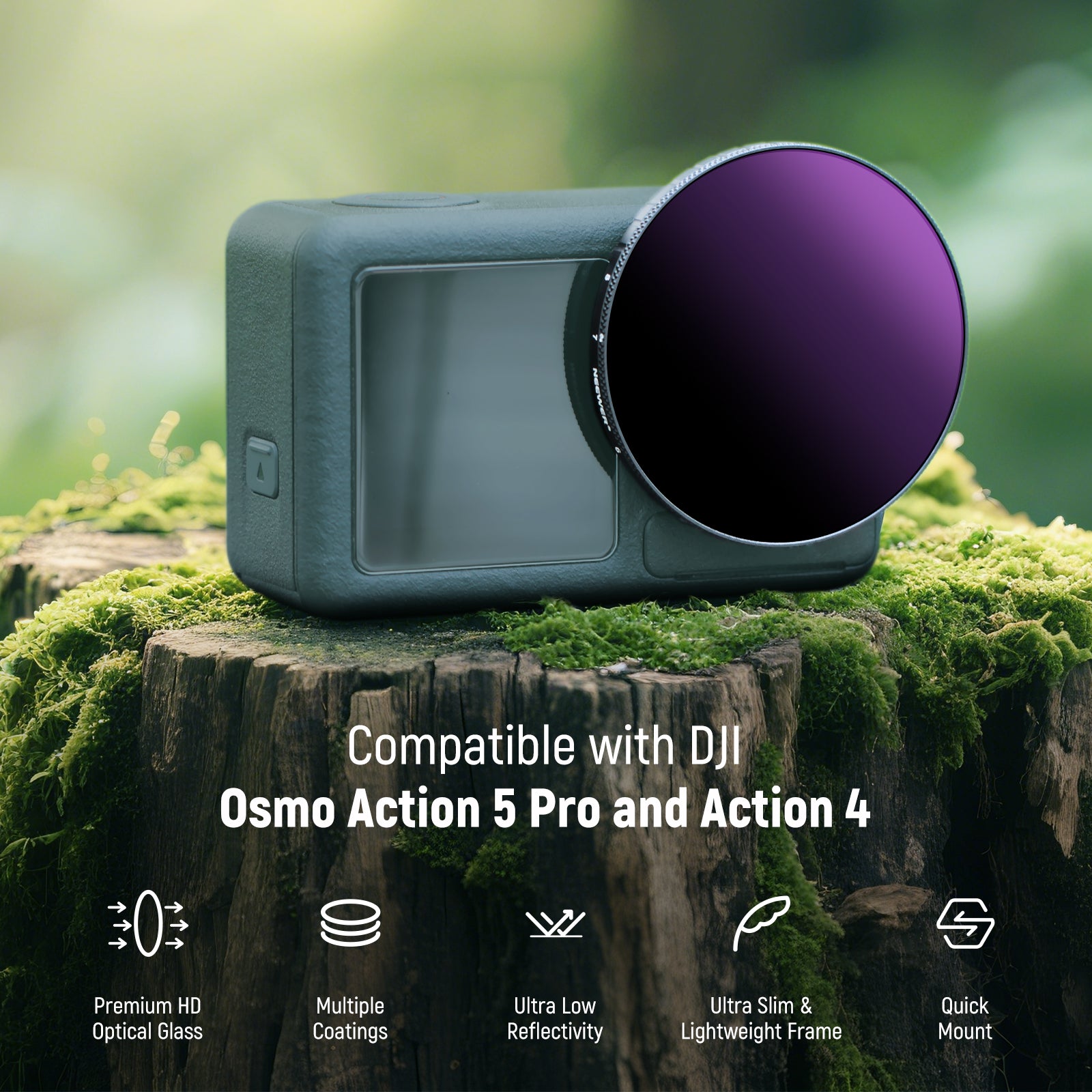 - Para Action 5 Pro y Action 4 : compatible con DJI Osmo Action 5 Pro y Action 4 Adventure Combo, este filtro de densidad neutra variable es ideal para una amplia gama de actividades deportivas, como surf, kayak, esquí, ciclismo de montaña, paracaidismo, patineta y senderismo como accesorios de fotografía esenciales para creadores de contenido y equipo imprescindible para influencers.