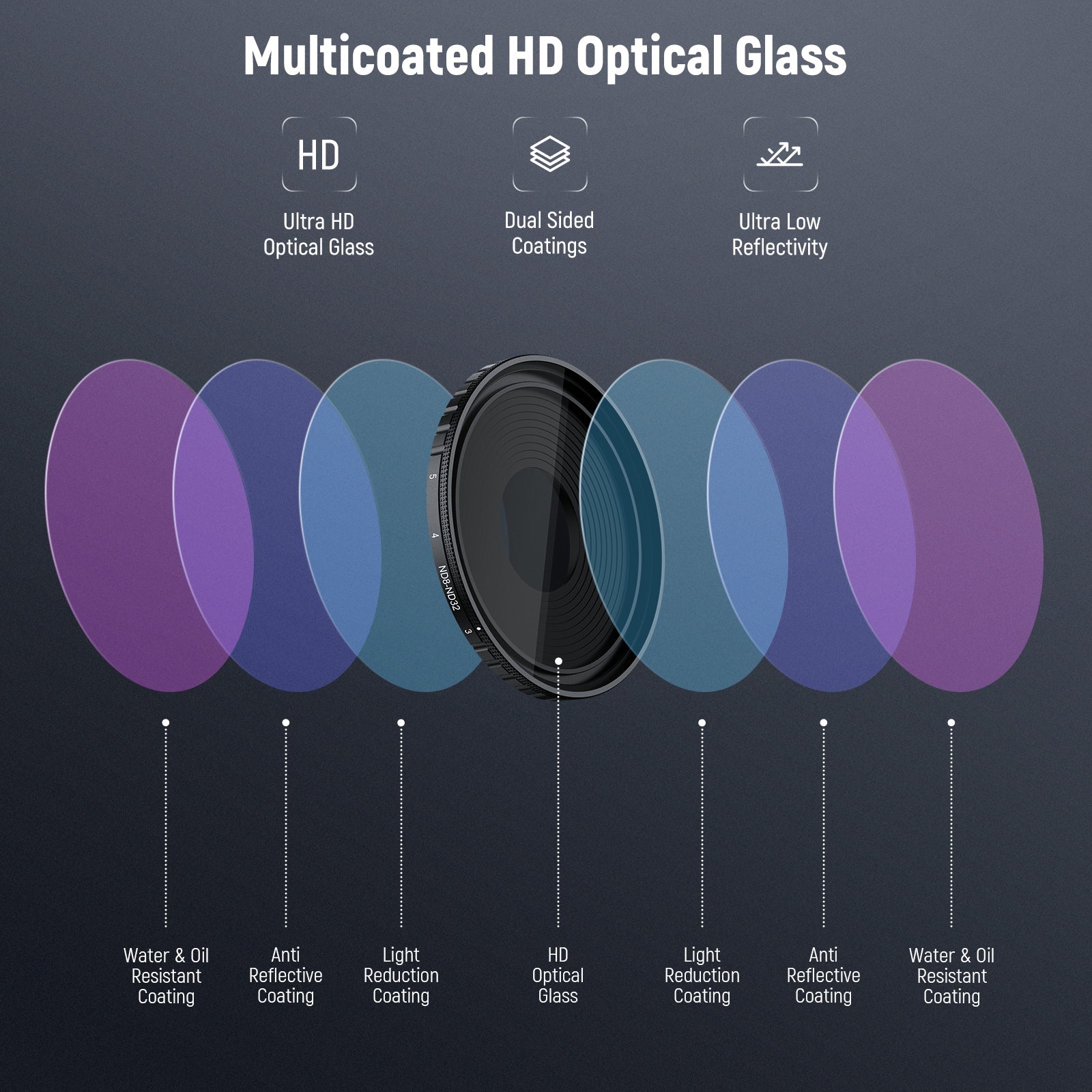 - Control de exposición fácil y preciso : el filtro ND8-32 variable ofrece de 3 a 5 pasos de reducción de luz ajustable para diferentes entornos de iluminación. Simplemente gire el marco exterior hasta las marcas exactas para obtener un equilibrio de exposición preciso y capturar el movimiento con un desenfoque dinámico.