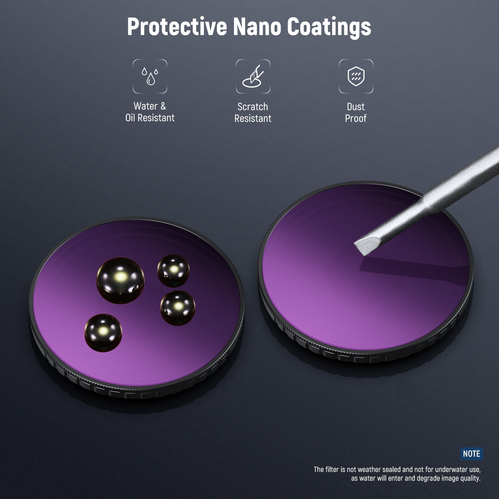- Marco ultradelgado y liviano : fabricado con aleación de aluminio de primera calidad, el marco de filtro delgado con un acabado mate garantiza una durabilidad excepcional en condiciones difíciles al tiempo que evita viñetas no deseadas y destellos de lente.