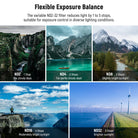 - Flexible Exposure Balance- The variable ND2-32 and ND64-512 filters reduce light by 1 to 5 stops and 6 to 9 stops, respectively, suitable for exposure control in diverse lighting conditions. They allow you to capture rivers, waterfalls, and light trails with dynamic motion blur—adding a cinematic touch to your drone footage