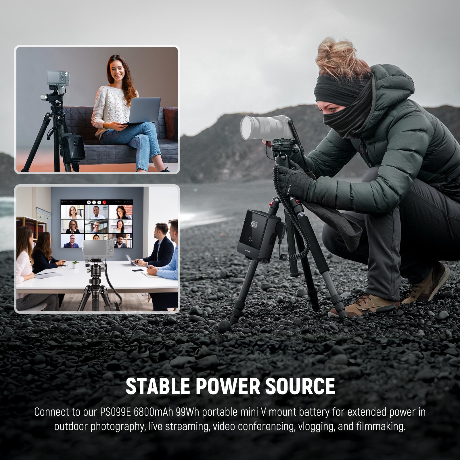 - Energía estable para grabaciones más largas y seguras : olvídate de las fallas de los cables y protege tus grabaciones más importantes. Nuestro chip inteligente garantiza una fuente de alimentación constante y estable para tus creaciones. Conéctate a nuestra batería portátil PS099E de 6800 mAh y 99 Wh con montura en V para obtener energía extendida en fotografía al aire libre, transmisión en vivo, videoconferencias, vlogs y realización de películas.