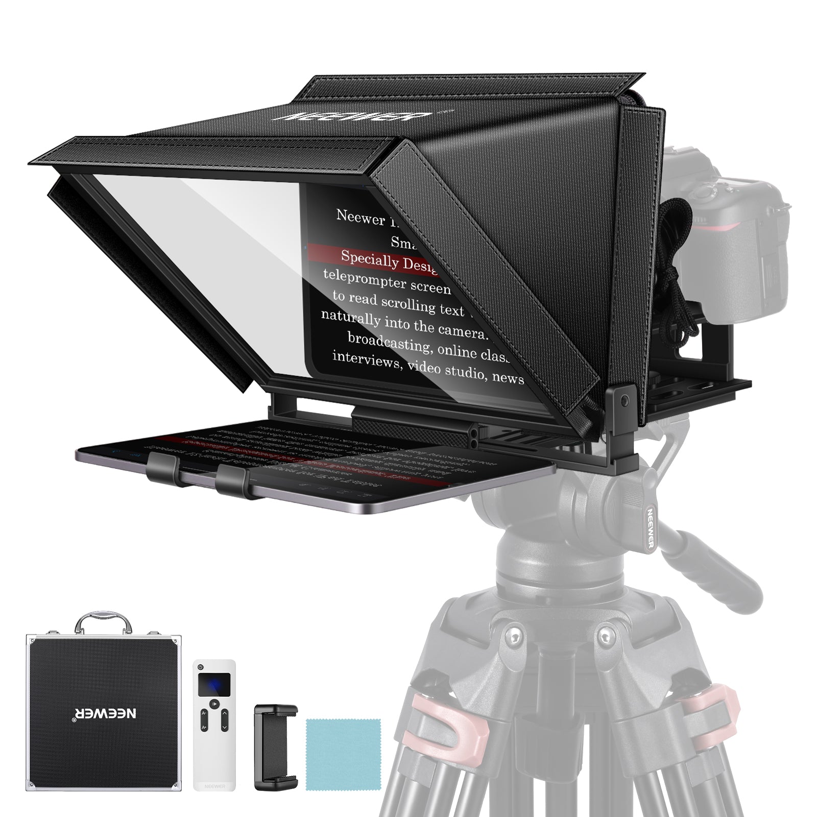 - Antes de utilizar el Teleprompter, descargue la aplicación NEEWER Teleprompter en Apple Store o Google Play. Puede importar o ingresar texto manualmente y configurar el tamaño de fuente, la velocidad de reproducción, el fondo y el color de fuente. Además, puede pausar, acelerar o reducir la velocidad y pasar páginas libremente mediante el control remoto. La aplicación es compatible con iOS 11.0 o posterior/Android 6.0 o posterior.